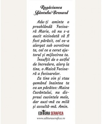Semn de carte cu Rugăciunea Sfântului Bernard: Adu-ţi aminte, o preablândă Fecioară Marie, că nu s-a auzit niciodată să fi fost părăsit, cel ce a alergat sub ocrotirea ta, cel ce a cerut ajutorul şi mijlocirea ta. Însufleţit de o astfel de încredere, alerg la tine, o Maică Fecioară a fecioarelor, la tine vin şi stau gemând înaintea ta ca un păcătos: Maica Cuvântului,nu dispreţui cuvintele mele, dar auzi-mă cu milă şi ascultă-mă. Amin.
