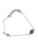 Rozariu pe ață, bile de plastic. Crucea are medalia Sfântului Benedict.