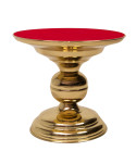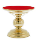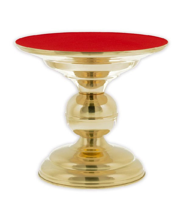 Suport monstranță din alamă, protejat cu un lac special, înălțime 21 cm, diametru jos 17 cm, diametru sus 24 cm. Partea de sus acoperită cu o pânză roșie decorativă.