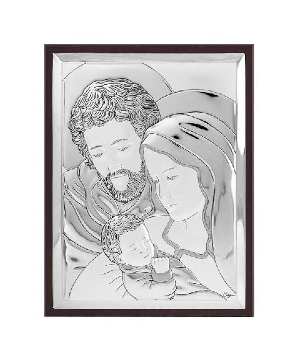 Icoană Sf Familie este pictată pe o ramă din lemn alb și decorată cu glitter auriu. Perfectă pentru a fi oferită ca dar la botez, nuntă sau alte ocazii speciale.