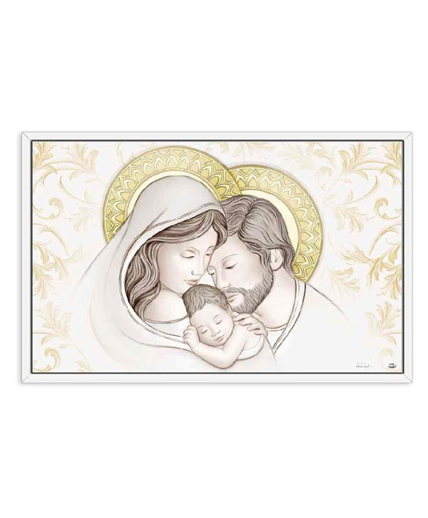 Icoană Sf Familie este pictată pe o ramă din lemn alb și decorată cu glitter auriu. Perfectă pentru a fi oferită ca dar la botez, nuntă sau alte ocazii speciale.