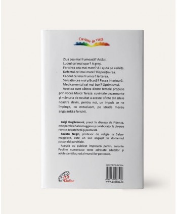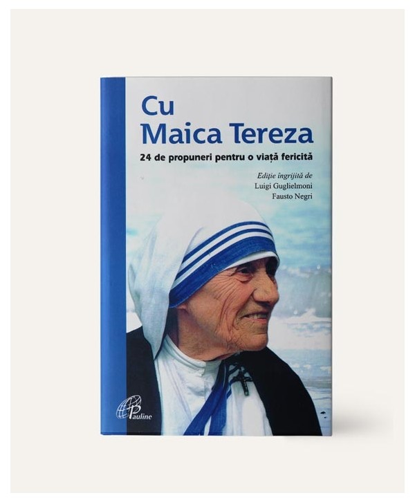 Cu Maica Tereza. 24 de propuneri pentru o viata fericita. Cele douăzeci și patru de întrebări pe care Maica Tereza le-a adresat ei înseși și răspunsurile pe care şi le-a dat devin un itinerariu către un nou umanism. Calea spre realizarea deplină a propriei persoane, indicată de către sfânta din Calcutta în termeni foarte practici, poate fi rezumată prin aceste cuvinte simple: „Să facem lucruri mici cu iubire mare” și „zi după zi”. Cu sfaturile sale prețioase, cu povestirea unor episoade ale existenței sale, cu puterea rugăciunilor sale, Maica Tereza trezește și astăzi entuziasmul celui care dorește să o cunoască, așa cum, în timpul vieții sale, insufla energie colaboratorilor ei. Textele altor autori folosite pentru aprofundarea fiecărei tematici și trimiterea la magisteriul papei Francisc ne vorbesc despre sintonia deplină a gândirii Maicii Tereza cu tradiția permanentă a Bisericii